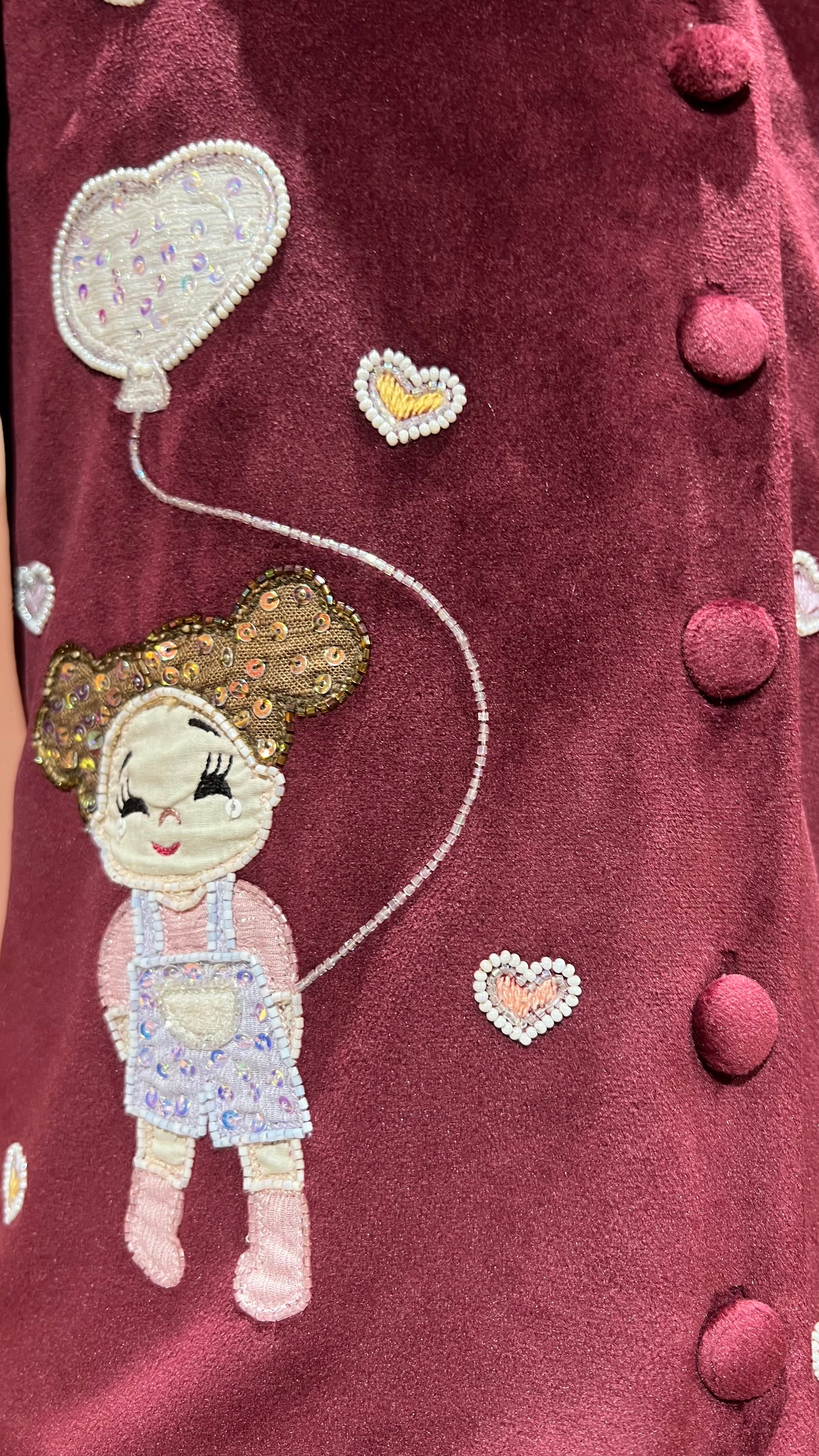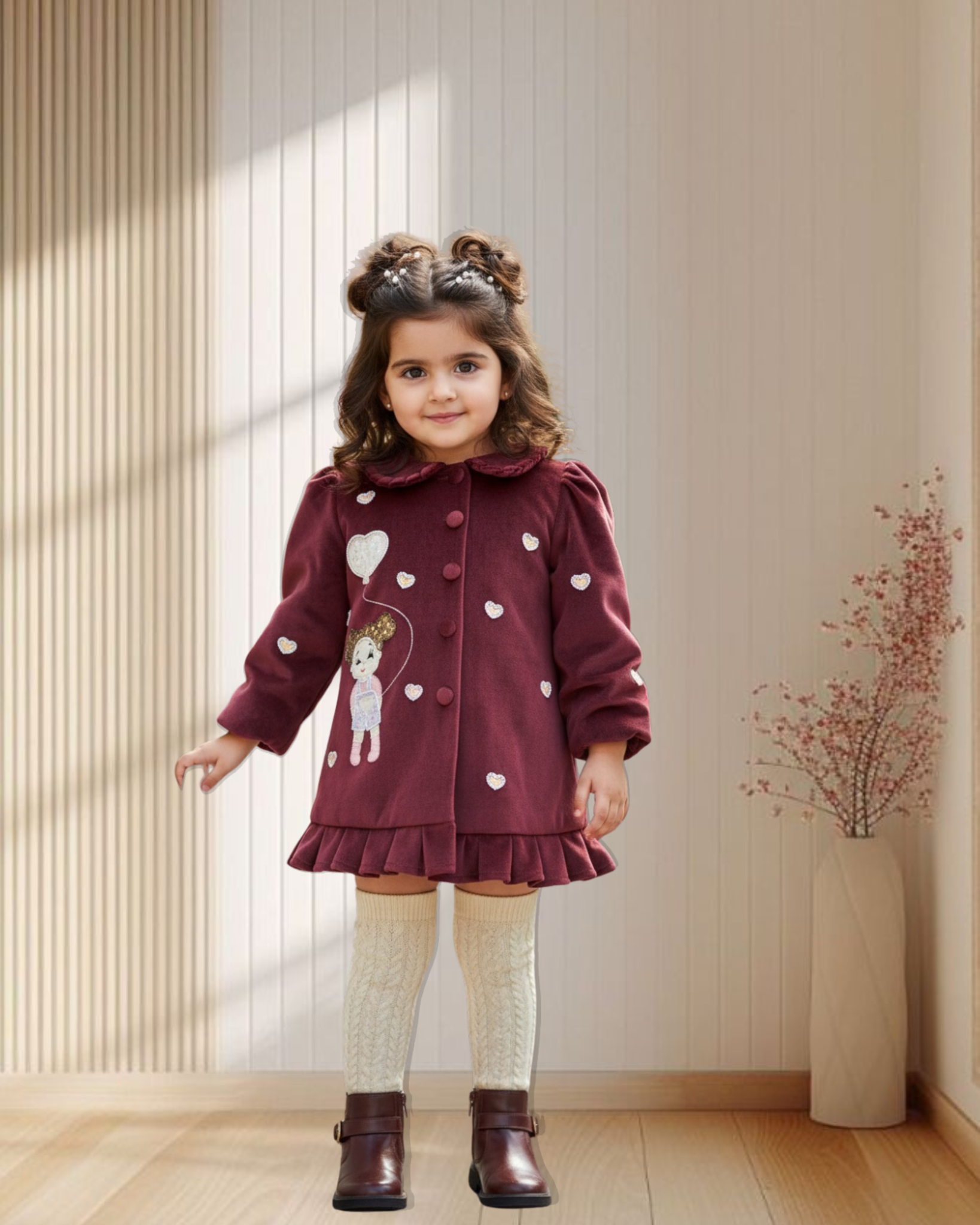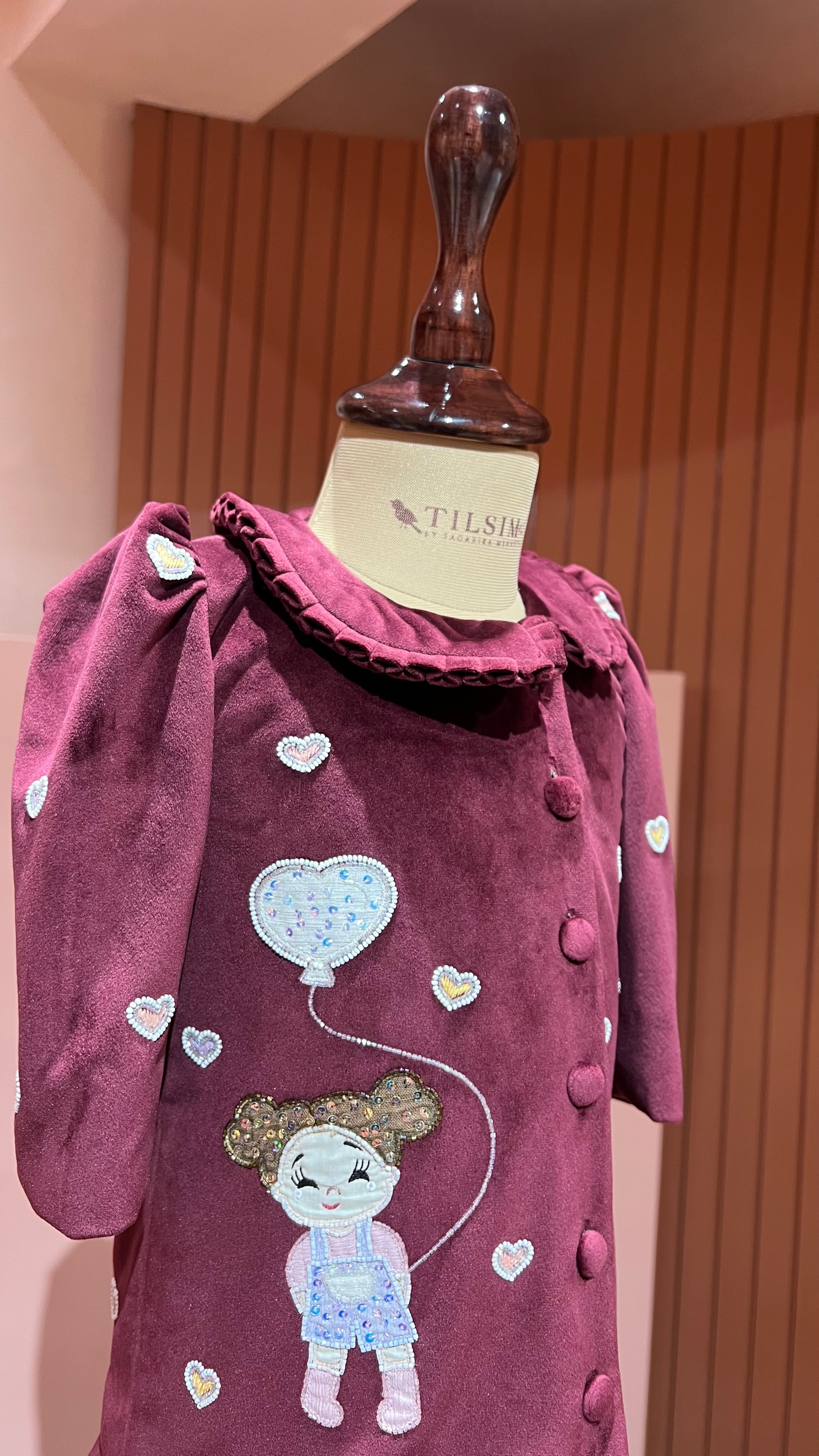 A charming berry-toned dress with heart accents and playful balloon embroidery. Designed for little dreamers who love comfort with a touch of magic.