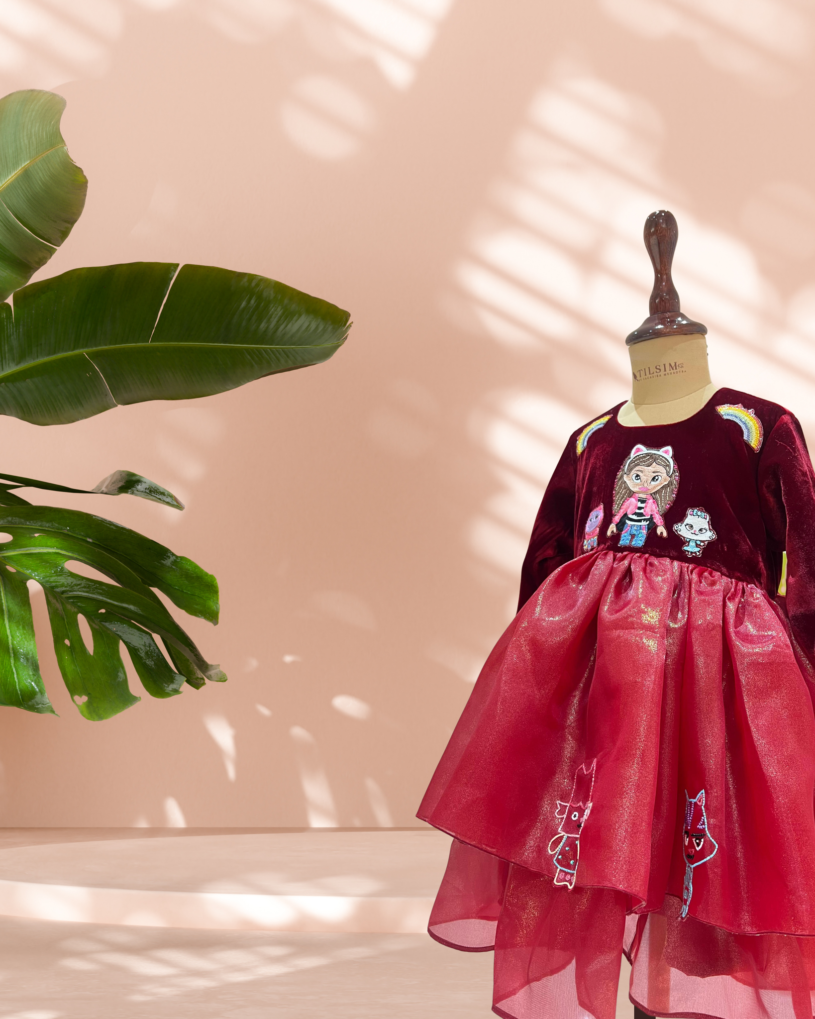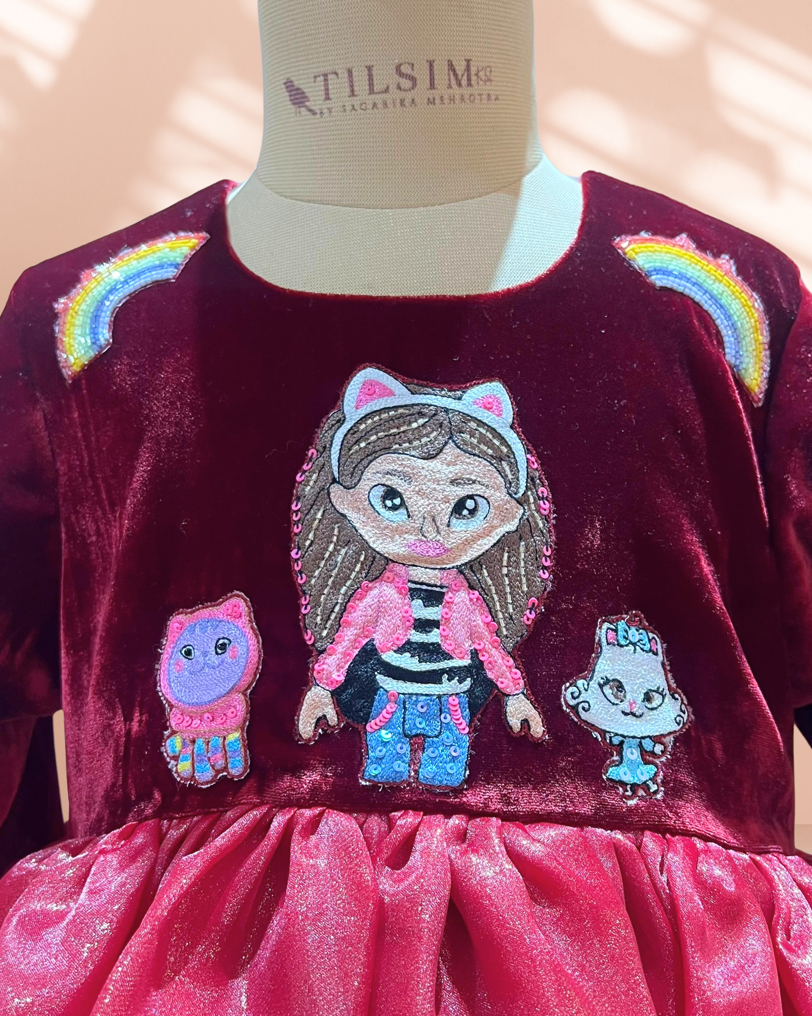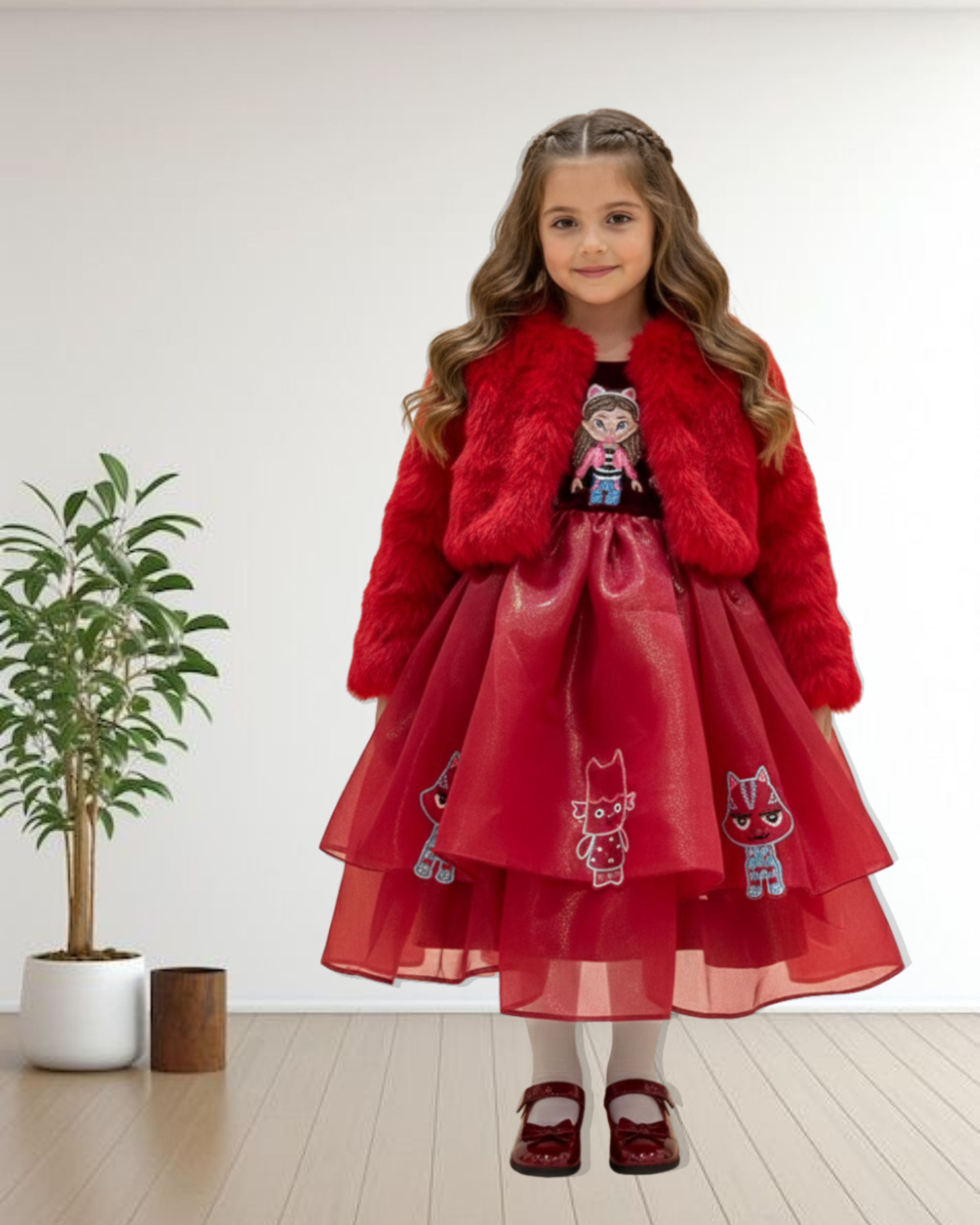 This enchanting party dress features a layered tulle skirt adorned with playful character embroidery, paired with a soft faux-fur jacket for a cozy yet glamorous finish. Perfect for winter celebrations, birthdays, and special moments where little stars shine bright.