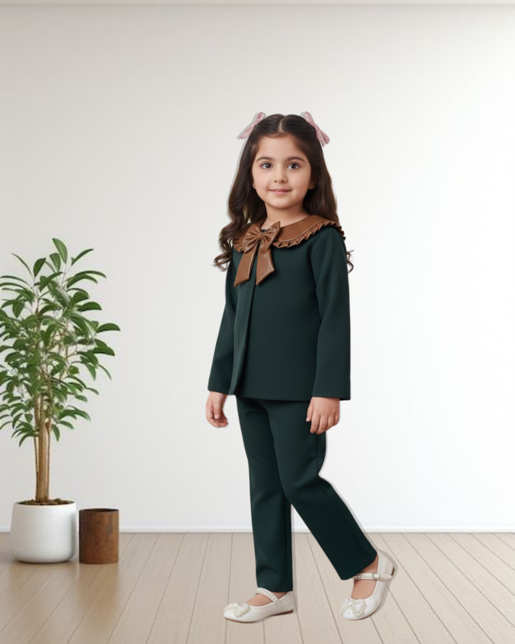 A timeless co-ord set in deep emerald hues, finished with a charming statement bow and soft ruffle detailing. Designed for elegant occasions and everyday moments that call for effortless sophistication.