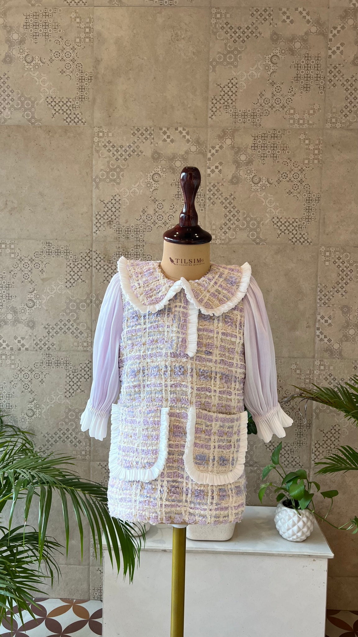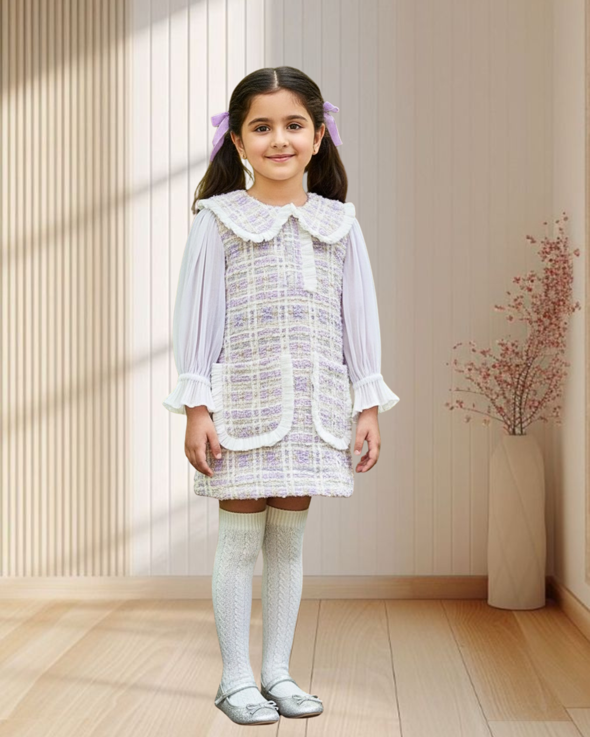 A timeless blend of elegance and innocence. Crafted in soft lavender tweed with a delicate lace-trimmed collar and sheer puff sleeves, this dress is perfect for garden parties, festive afternoons, and picture-perfect moments. Classic charm, reimagined for little style icons.